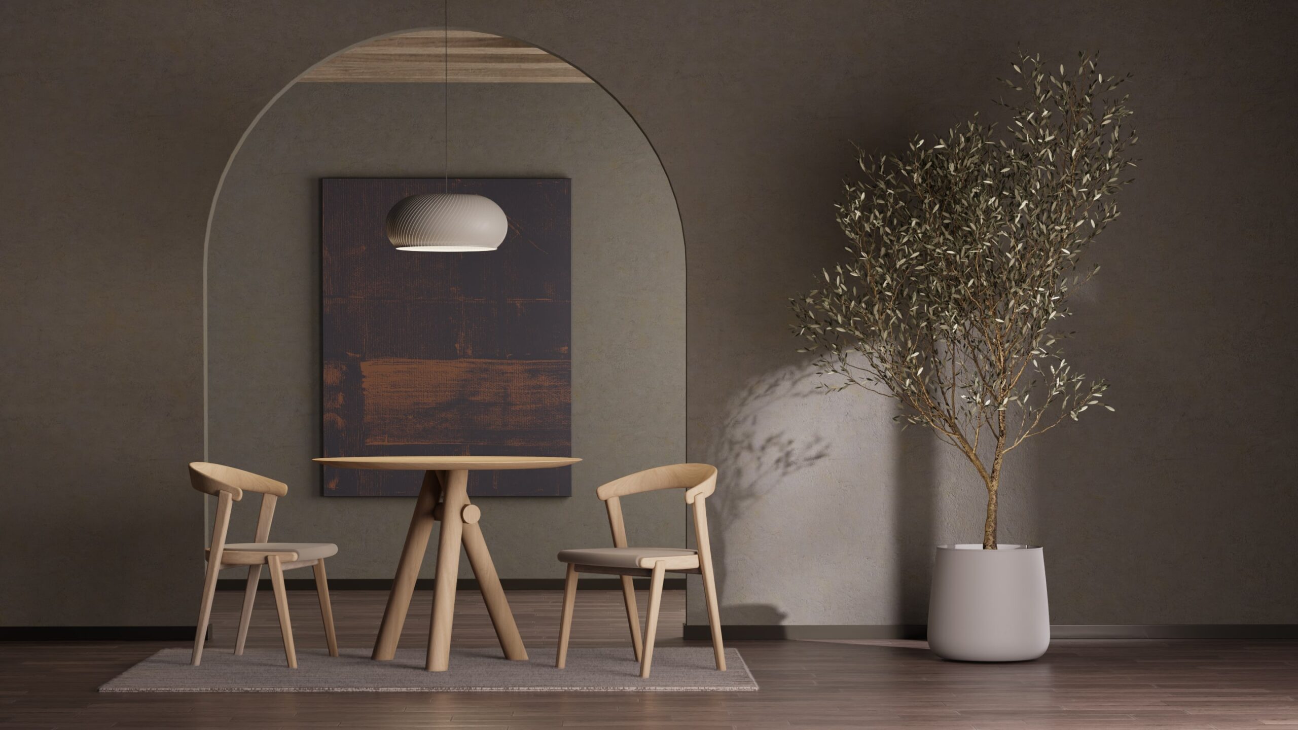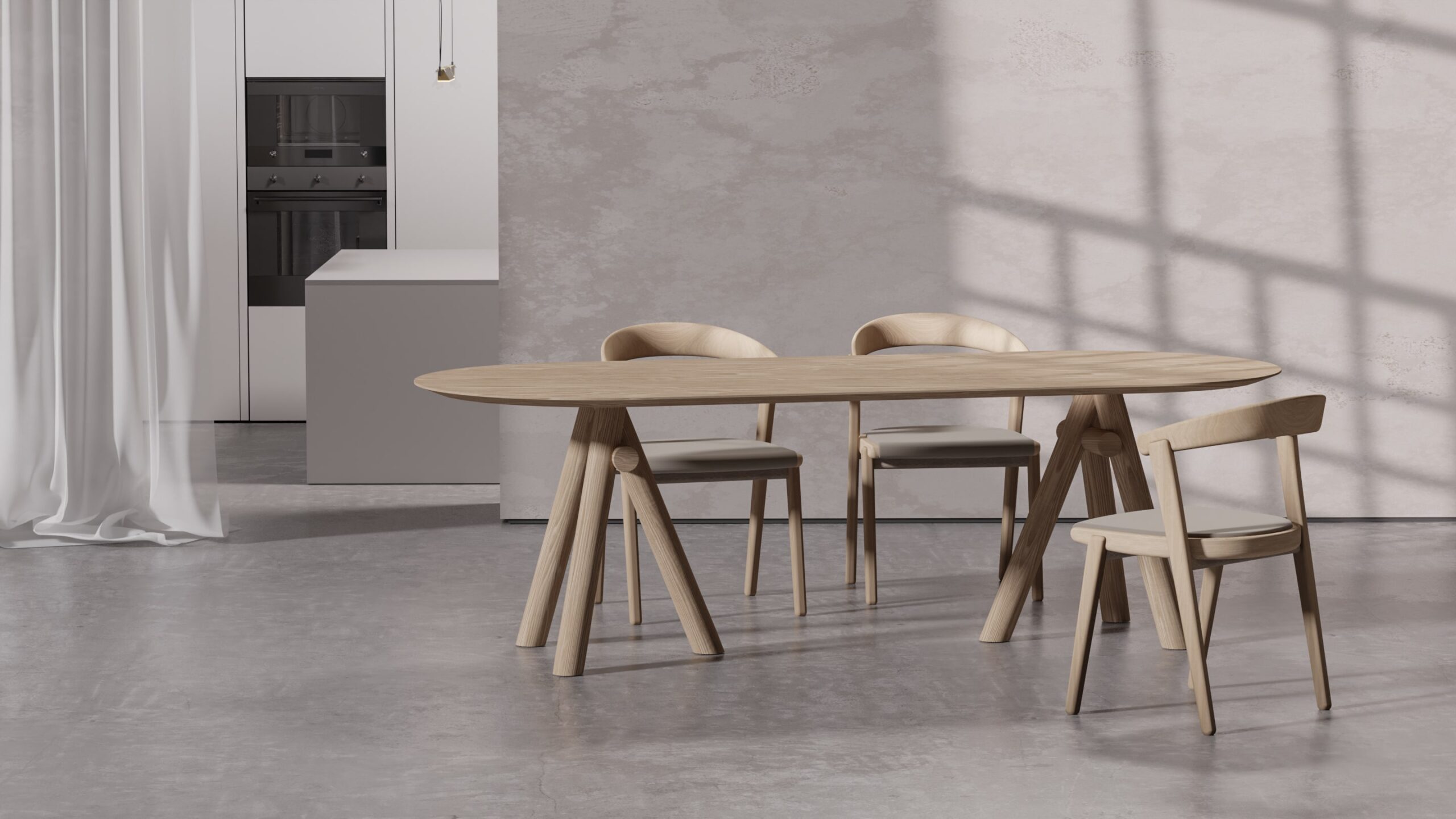 Geometric legs connected through a central joint provide structural integrity while maintaining a serene, balanced aesthetic, resulting in a table that is simultaneously elegant and commanding.
